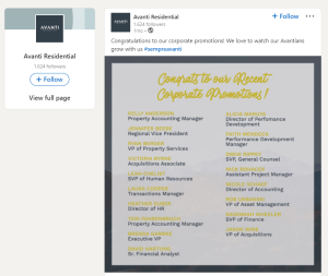 Hats off to Avanti Residential and Steadfast Management for spotlighting their team members who earned promotions. Job candidates who see these posts will feel confident that these companies offer opportunities for future growth.