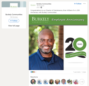 This post from Burkley Communities does a couple of things at once: it rewards and celebrates an individual contributor and shows off that this person has been with the firm for 20 years. That’s a LONG time! Job candidates are likely to see the post and think, “That must be a great place to work if people stick around that long!”