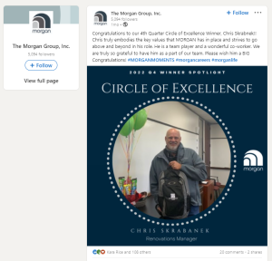 This is just one of many posts from The Morgan Group that show how they celebrate their high-performing employees. Note how they showcase not just the individual’s performance, but how it aligns with their values: “Chris truly embodies the key values that MORGAN has in place and strives to go above and beyond in his role.”