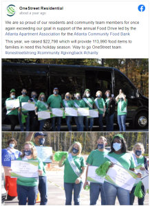 Finally, here is the team at OneStreet Residential celebrating their community service efforts as contributors to the annual Food Drive led by the Atlanta Apartment Association. Who wouldn’t be inspired to be a part of this team of big-hearted movers and shakers who raised more than $22,000 for their local community? Great work, OneStreet team!