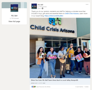 One of P.B. Bell’s core values is “Show You Care.” Check out this social share and the blog post it links to which highlights the company’s extreme generosity (and the good time team members had while doing good.)