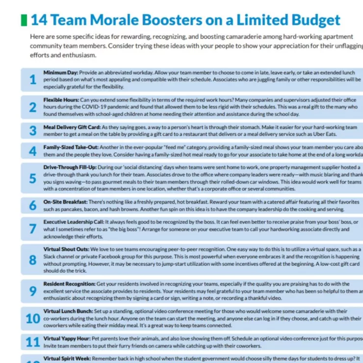 Here are some specific ideas for rewarding, recognizing, and boosting camaraderie among hard-working apartment