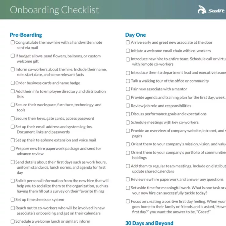 In multifamily, onboarding can be a challenge. At Swift Bunny, we are making it easier than ever to onboard new rental housing industry professionals with our free and easy checklist. Don’t forget to check out our next product release, Introduce, and find out just how efficient and organized onboarding any position in your apartment industry organization can be!